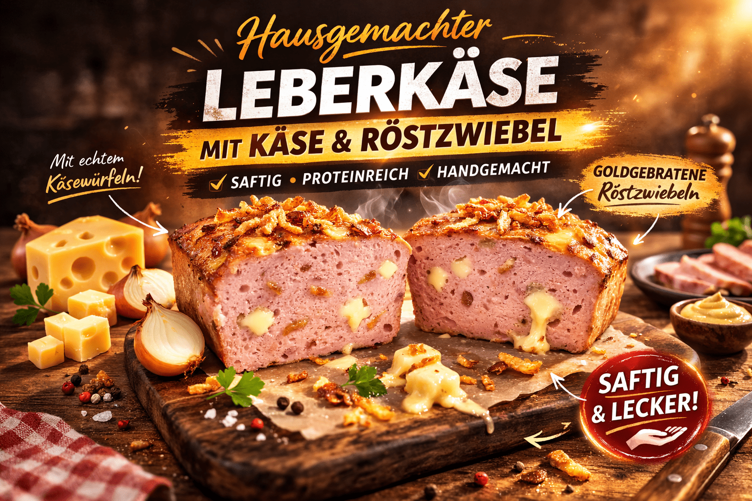 Leberkäse mit Käse und Röstzwiebeln