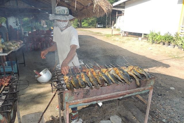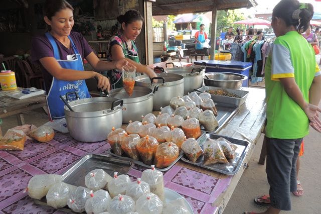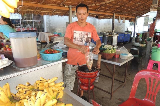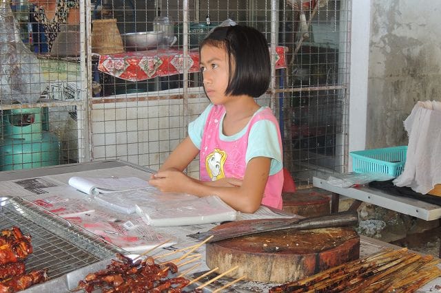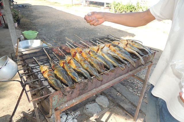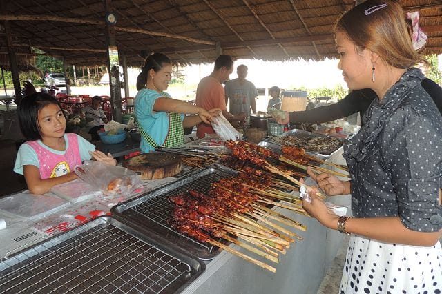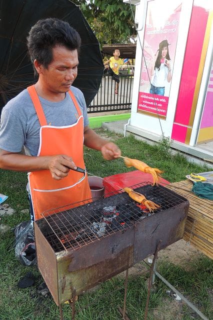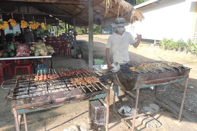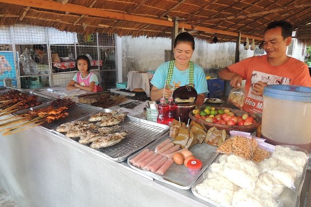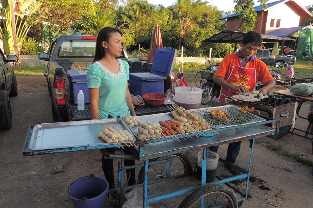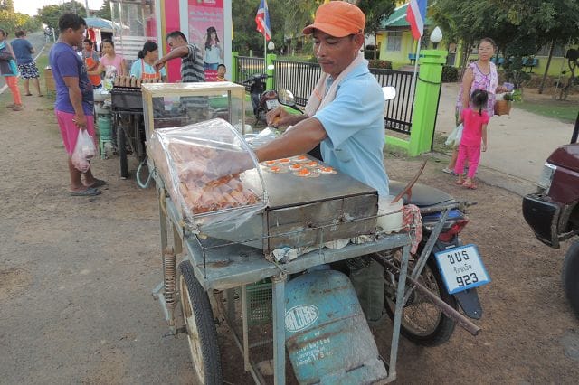 Hier einer von den typischen Grillstaenden wie es sie zu hunderten gibt. Was in Deutschland wohl die Bratwurst oder der Leberkaessemmel das ist hier das gegrillte Huhn mit dem Papayasalat.