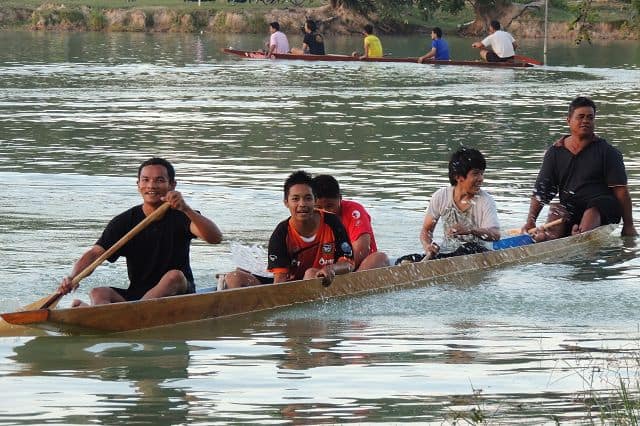 Und weil hier in diesen Tagen Loi Krahtong ist, ueben sie auf dem angrenzenden See fuer das statt findende Bootsrennen.