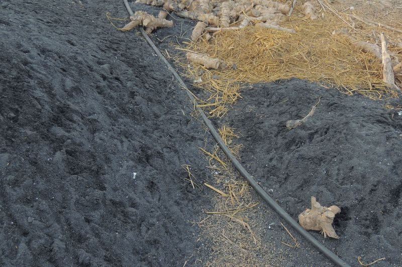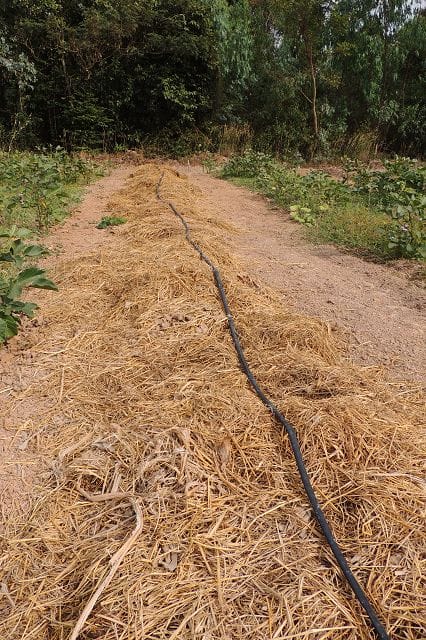 Dort kippe ich den Mist in einer Reihe hin und bedecke alles mit Stroh und oben drauf den Schlauch mit dem Troepfesystem das der Mist immer ein wenig feucht hat.