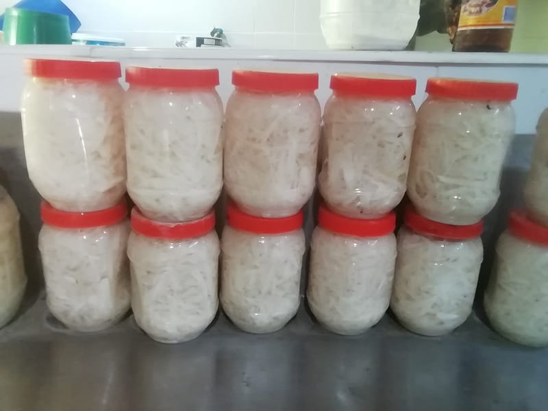 Er kann in sollche Behaeltnissen dann fermentieren und ist viele Monate haltbar. Auch ungekuehlt. Das Ergebniss ist dann ein etwas saurer Bambus. Im Prinzip hald wie Sauerkraut.