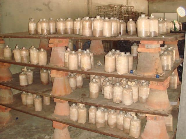Die Pilzsporen und die Kultur bekommt er aus Udonthani. Laut seiner Aussage kommt ihn ein Beutel auf um die 4 Bath bei der Herstellung. Man muss aber auch dazu sagen das er die Sporen sehr guenstig von einem Freund bezieht.
