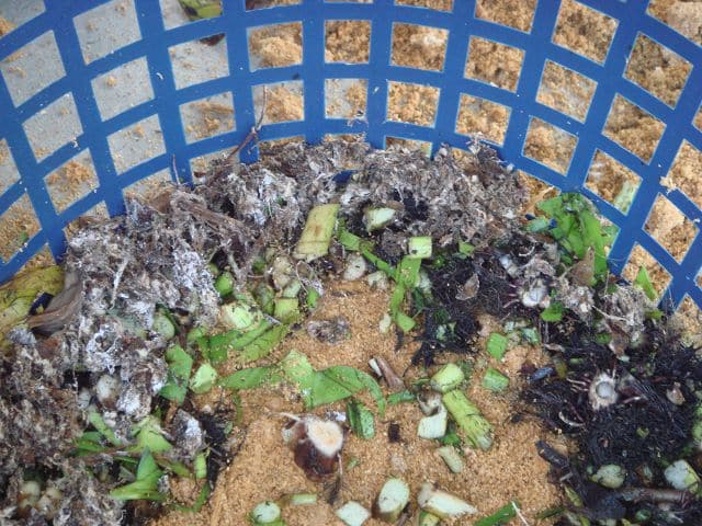 Dazu werden Wasserhyazinten gehackt und schichtweise in einen Korb mit den alten Pilzbeutel geschichtet.