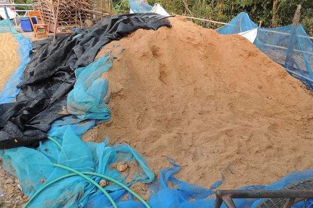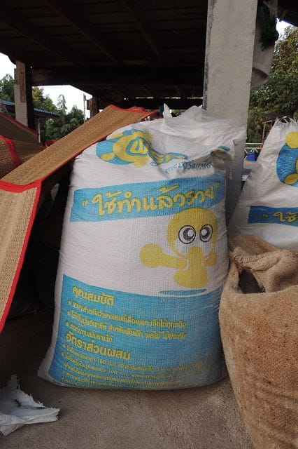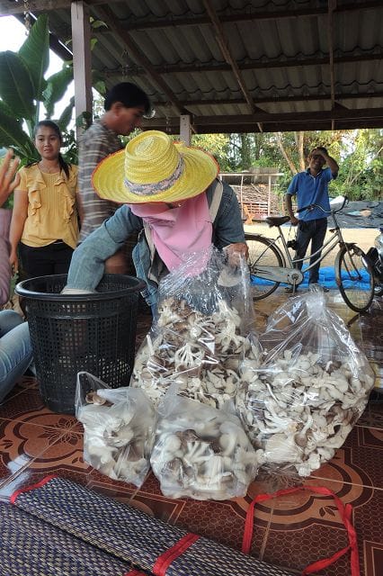 Der hier macht es jetzt ein wenig anderst. Er kauft eine Pilzkultur und mischt diese mit Sägemehl vom Kautschukbaum. Kommt aus dem Süden von Thailand für 2500 Bath die Tonne.