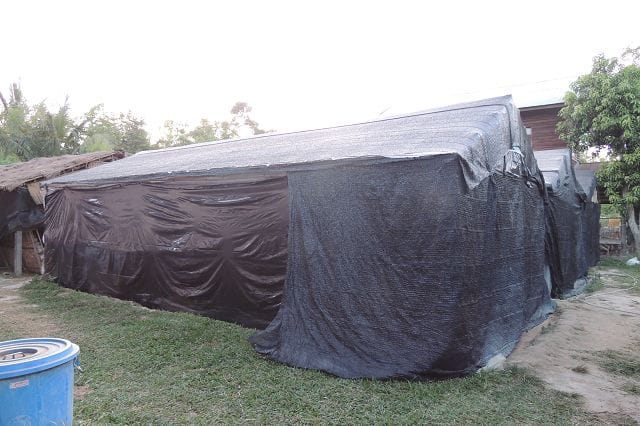 Pilzhaus von aussen. Strohdach und eine schwarze Folie als Wand.