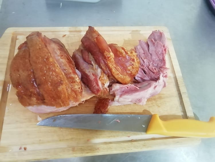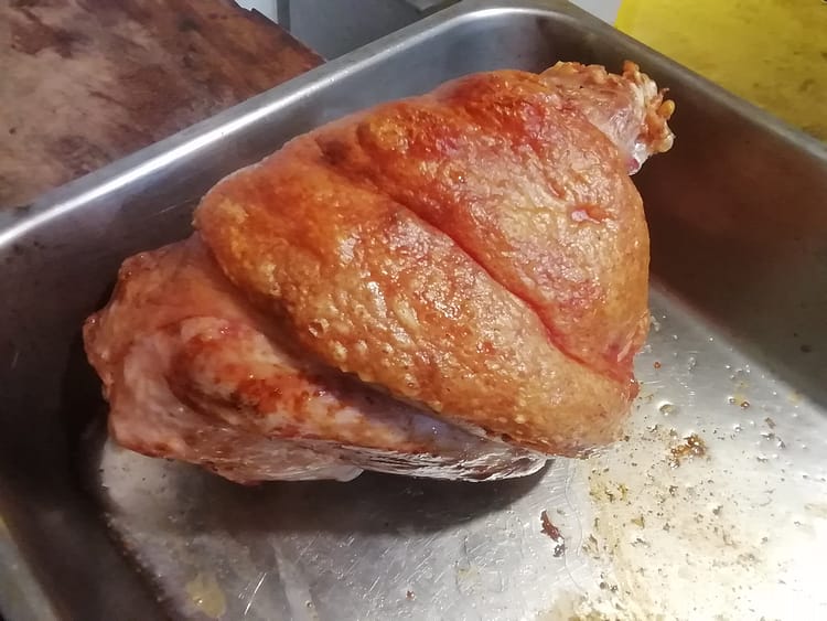 Fertig gebratene Schweinshaxe. Mit oder ohne Knochen. Preis ist der gleiche.