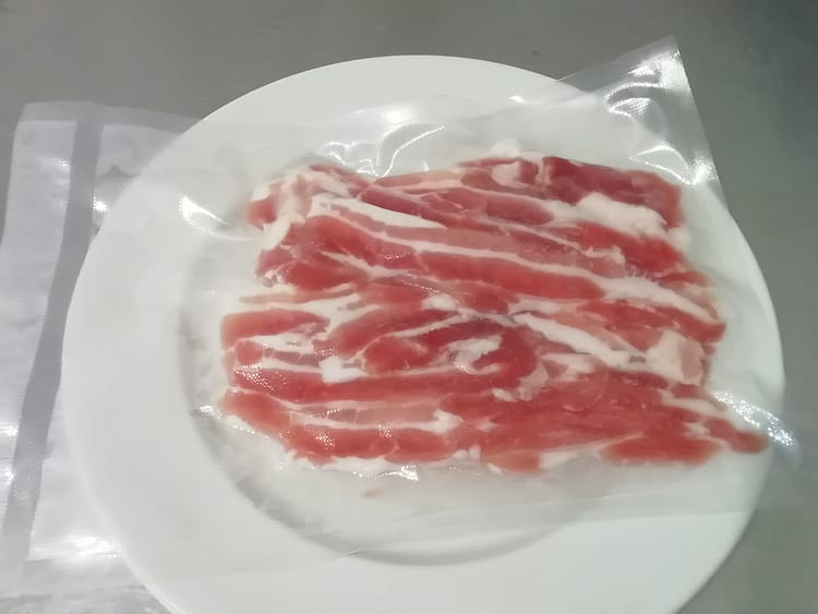 Ein mild gepoekelter Bauch in Streifen geschnitten.