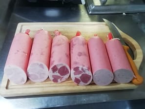 Feinbraet das in einen Darm gefuellt wird und danach im heissen Wasser gebrueht wird.