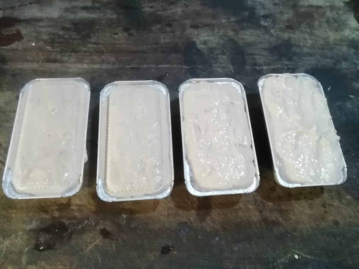 Roher Leberkaese zum selber backen in 500 gr. Formen. Die Form fuer 150 Baht.