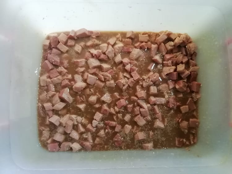 Gepoeckelte Schlegelstuecke werden vorgekocht und gewuerfelt