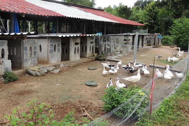 ich bin in der nähe von Chumpae und wir haben seit etwa 6 monaten eine eher kleinere farm mit unterschiedlichsten „bewohnern“ 22 legeenten, 39 fleischenten, ca. 40 hühner incl. küken… die vermehren sich ja wie die karnickel… noch 4 von 10 schweinen, 5 truthähne, ein gänsepaar… hoffe ich hab nichts vergessen zu erwähnen… die legeenten sind auch nachts drinnen, alle anderen tiere ausser die schweine sind tag und nacht draussen. habe sozusagen 2 inseln. auf der einen sind die ställe, die andere ist der auslauf für die tiere.
