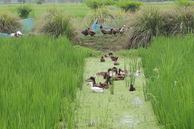 Hier noch ein Bild von der BIO Farm. Dort lässt man die Enten, wenn de Reis eine bestimmte Groesse erreicht hat in die Reisfelder um die darin befindlichen Schnecken und Krabben zu verzehren. Biologische Ungezieferbekaempfung.
