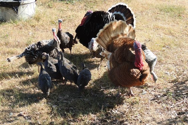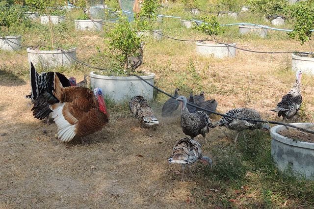 So, die Perlhühner haben sich auch eingelebt und sind immer mit den Truthuehnern zusammen.