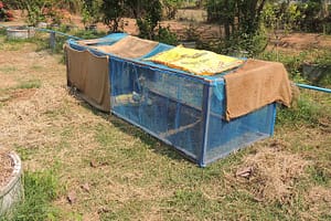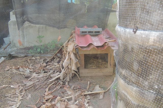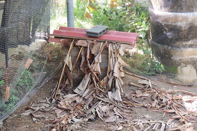 Letzte Woche habe ich dann den Unterschlupf wo sie frueher ihre Eier immer gelegt haben in’s freie gestellt und nur ganz einfach ein paar trockene Bananenblaetter hingehaengt und nun habe ich die Tage mal nachgeschaut und fand 6 Eier darin.