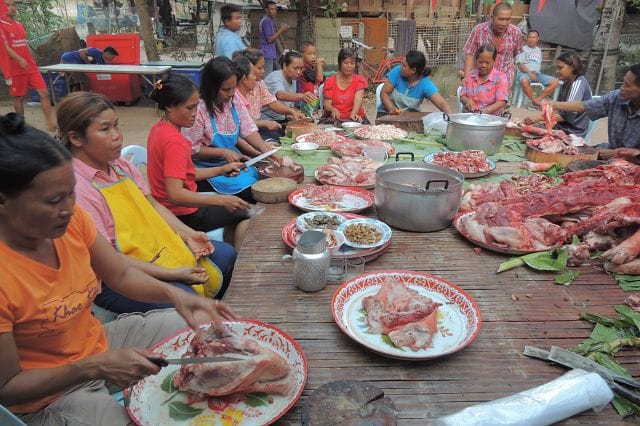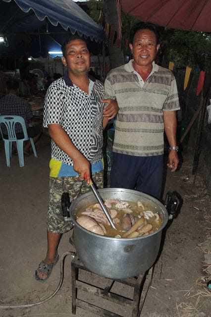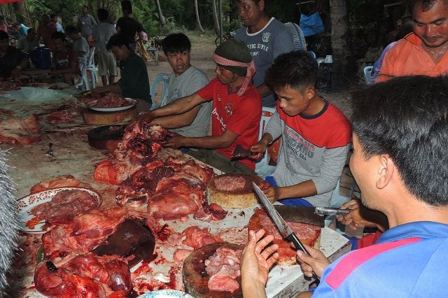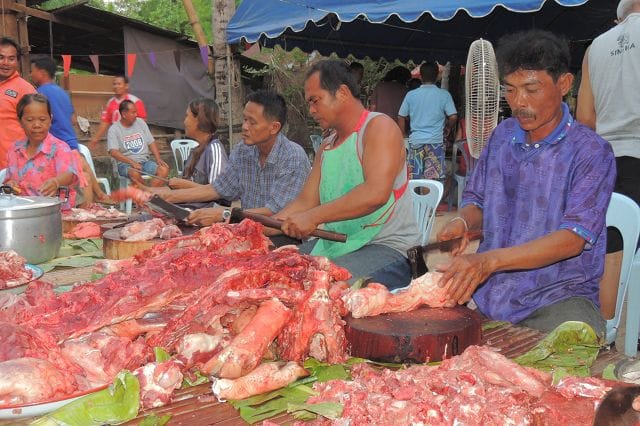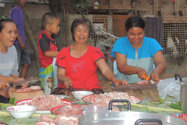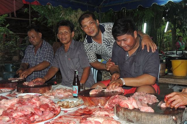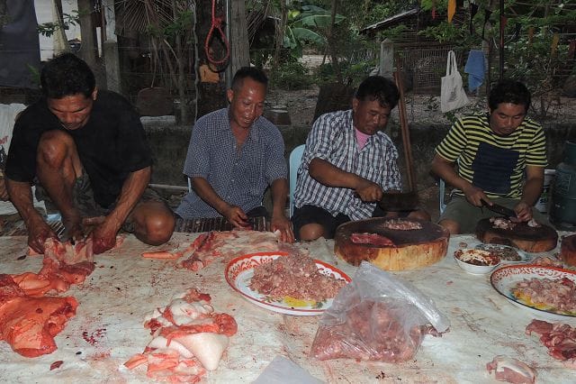 Im Dorf war eine Feier.  Ein junger Mann geht für ein paar Wochen/Monate in den Tempel und das gehört gebührend gefeiert. Mir geht es jetzt aber nicht um die Moenchsfeier, sondern um die Verarbeitung der Schweine auf der Feier.